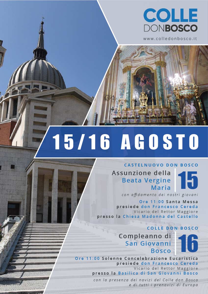 In data 15 e 16 agosto 2019, al Colle don Bosco ed a Castelnuovo don Bosco, avranno luogo i festeggiamenti per l’Assunzione della Beata Vergine Maria ed il compleanno di San Giovanni Bosco. Ecco qui di seguito il calendario degli eventi per i due giorni: