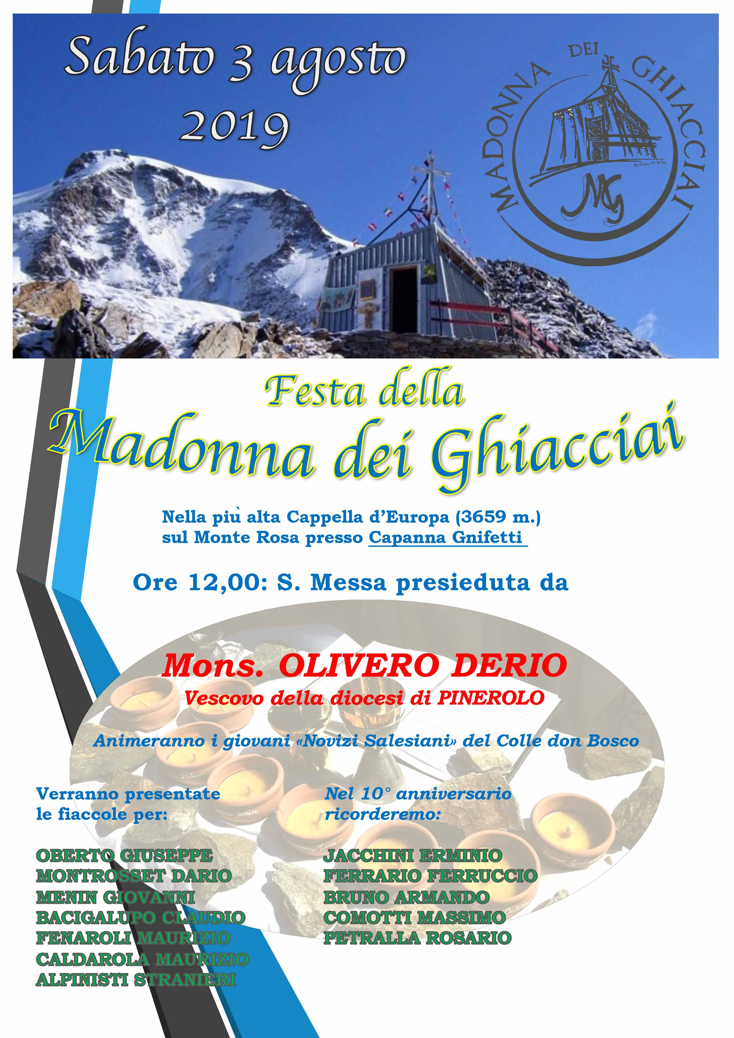 Da allora ogni anno la Festa è occasione per ricordare don Vescco ma anche tutti gli alpinisti morti nell’anno sul Monte Rosa o legati a quelle cime. Così nella celebrazione che quest’anno sarà presieduta dal Vescovo di Pinerolo, mons. Derio Olivero, si farà memoria di Dario Montrosset, Giuseppe Oberto, Giovanni Menin, Gerard Branche, Maurizio Caldarola, Claudio Bagicalupo, Maurizio Fenaroli e due alpinisti non identificati. Nel 10 anniversario saranno ricordati anche Jacchini Erminio, Ferrario Ferruccio, Bruno Armando, Comotti Massimo, Petralla Rosario. Novità di quest’anno l’animazione liturgica a cura di alcuni novizi salesiani di Colle don Bosco, che affideranno alla Madonna dei Ghiacciai il loro percorso di discernimento vocazionale.