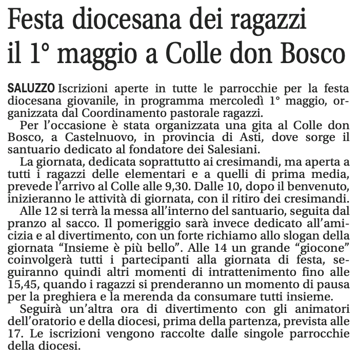 SALUZZO – Iscrizioni aperte in tutte le parrocchie per la festa diocesana giovanile, in programma mercoledì 1° maggio, organizzata dal Coordinamento pastorale ragazzi.